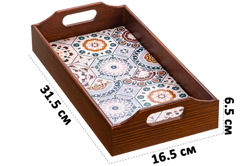 Прямоугольный поднос «Арабеск» от Elan Gallery поможет в эстетичной сервировке любимых блюд. Размер изделия – 31,5х16,5х6,5 см, толщина дна – 1,5 см. Высокие бортики выполнены из дерева, дно сложено из декоративных керамических плиток с ярким орнаментом. Каждое изделие изготавливается вручную, поэтому точный вид орнамента может варьироваться. Поднос идеально подойдёт для эстетичной подачи разнообразных угощений. Заполните его сервировочной посудой – прочные ручки помогут перенести содержимое между комнатами. Это изящный способ подать шашлык, сыр, фрукты и вино для романтического вечера. Преподнесите завтрак в постель с любимым кофе, проведите уютные перекусы на веранде или устройте неторопливую чайную церемонию. Многофункциональный поднос также послужит в качестве универсального органайзера. В спальне храните в нём косметику, украшения и парфюмерию. На столе заполните канцелярией, блоками записных листов, баночками с аромадиффузорами. Это идеальный вариант для создания декоративной композиции с фигурками, свечами и другими аксессуарами. Поднос станет оригинальным подарком для тех, кто ценит необычные вещи. Не рекомендуется применять абразивные моющие средства. Нельзя замачивать, не использовать в посудомоечной машине и микроволновой печи. Поставляется в дизайнерской картонной коробке – благодаря ей вам не потребуется дополнительная подарочная упаковка. В коллекции бренда Элан Галерея представлено много красивой посуды и стильных товаров для дома – выберите варианты на свой вкус!