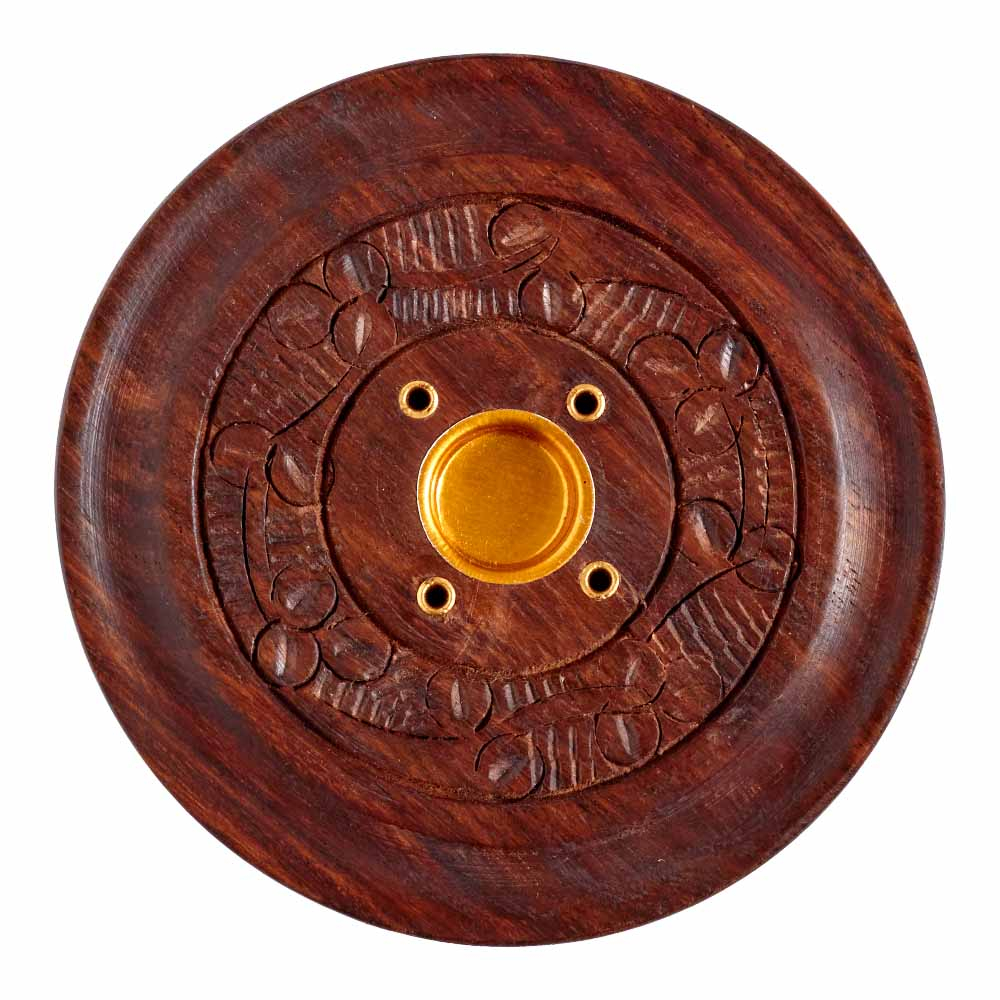 Стильным аксессуаром является подставка из древесины с резьбой. Это отличный подарок для ценителей ароматических процедур. Практичная подставка обеспечивает безопасность в процессе сжигания разных элементов благовоний. Изделие имеет вид удобной и красивой тарелочки. Благодаря изысканной резьбе подставку можно применять в качестве интерьерного декора. Тарелка поддерживает благовония и обеспечивает безопасность. Пепел не падает на мебель, а остается на подставке.