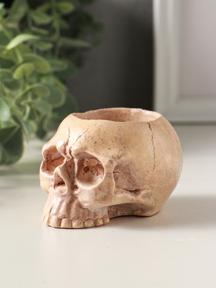 Этот скелет-подсвечник создаёт атмосферу загадочности и стиля. Он держит одну свечу, отбрасывая причудливые тени и наполняя пространство тёплым, живым светом. Классическая форма черепа, выполненная в благородном оттенке слоновой кости, делает его универсальным элементом декора — от мистического Хэллоуина до повседневной эстетики в стиле кабинета редкостей.