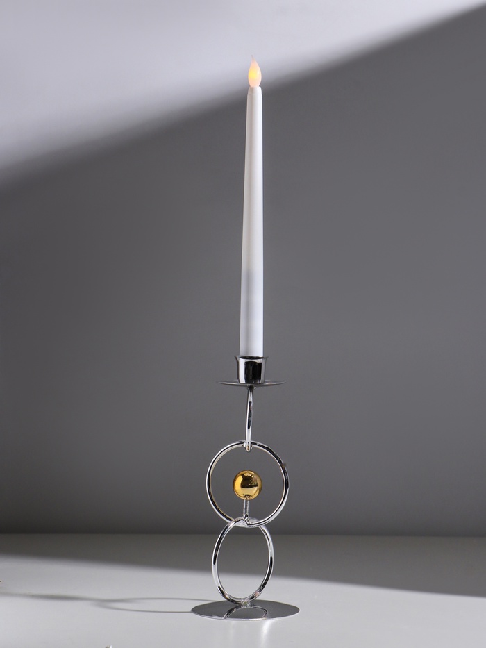 Современная интерпретация классического подсвечника, где геометрия встречается с изяществом. Чередование серебристых колец и золотистых шариков создаёт эффект парящей конструкции, которая при высоте 22 см становится изысканным акцентом любого торжества.