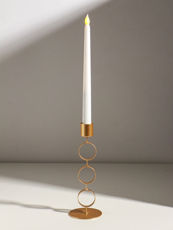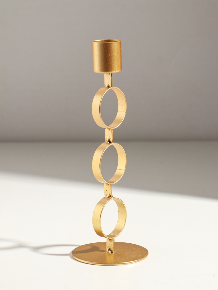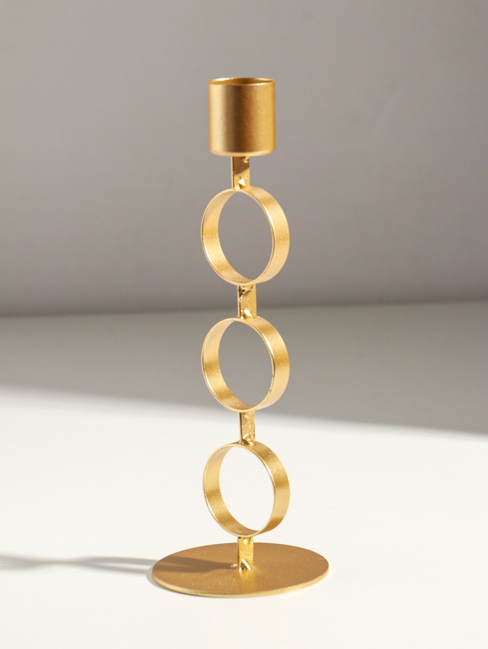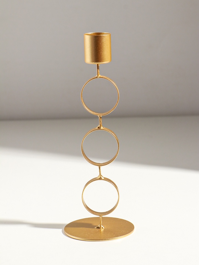 Этот золотистый подсвечник на одну свечу — элегантный акцент для дома. Его строгая геометрия из трёх колец создаёт современный силуэт, а тёплый золотой цвет добавляет уюта и торжественности. Универсальный дизайн гармонично дополнит и романтический ужин, и праздничный стол, и интерьер в стиле неоклассики или ар-деко.
