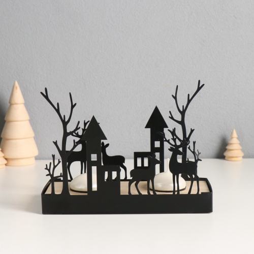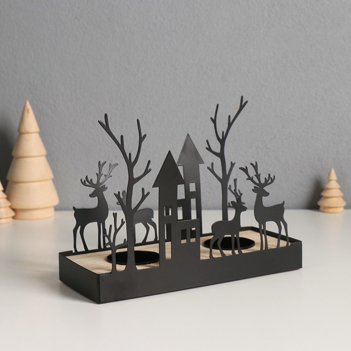 Подсвечник на 2 свечи «Олени и домика», d=4 см, металл, дерево, 7.5×18×14 см