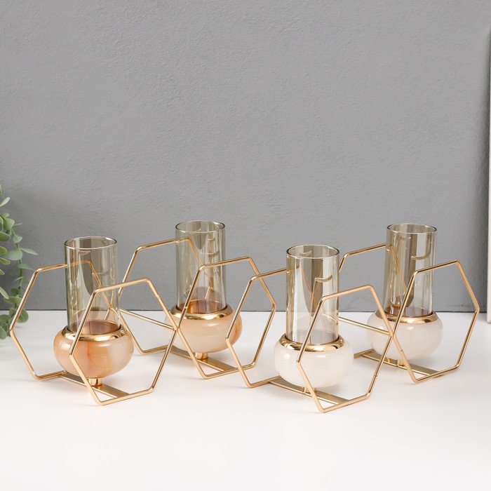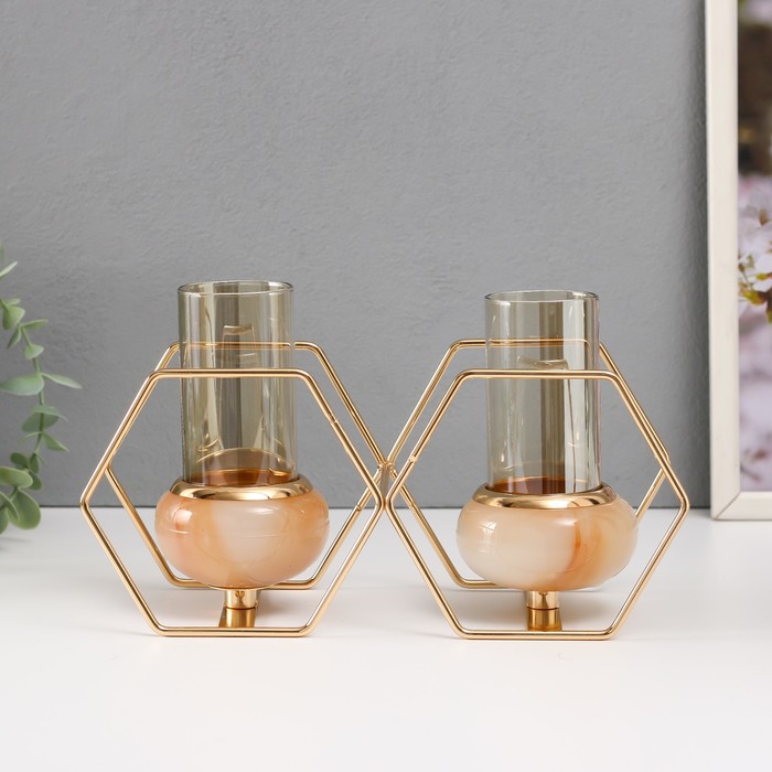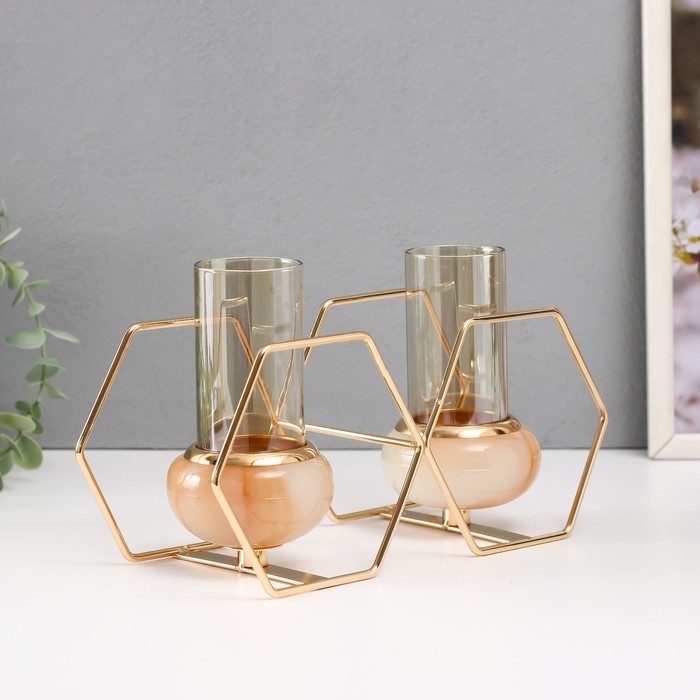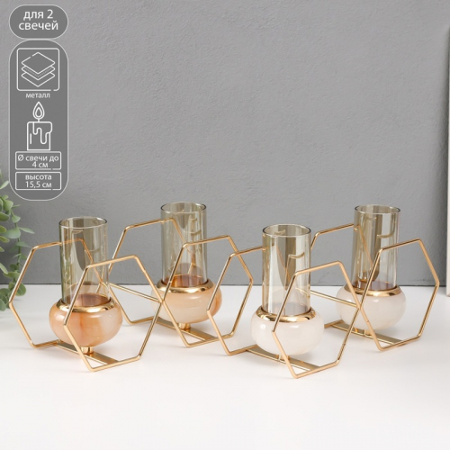 Подсвечник на 2 свечи «Шестигранники», металл, стекло, белый с золотом, 15.5×26.5×10.5 см