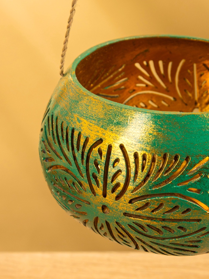 Подсвечник подвесной из кокоса, 14×14×10 см, голубой с золотым