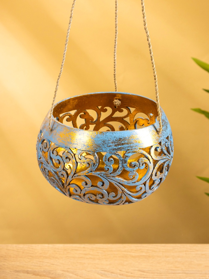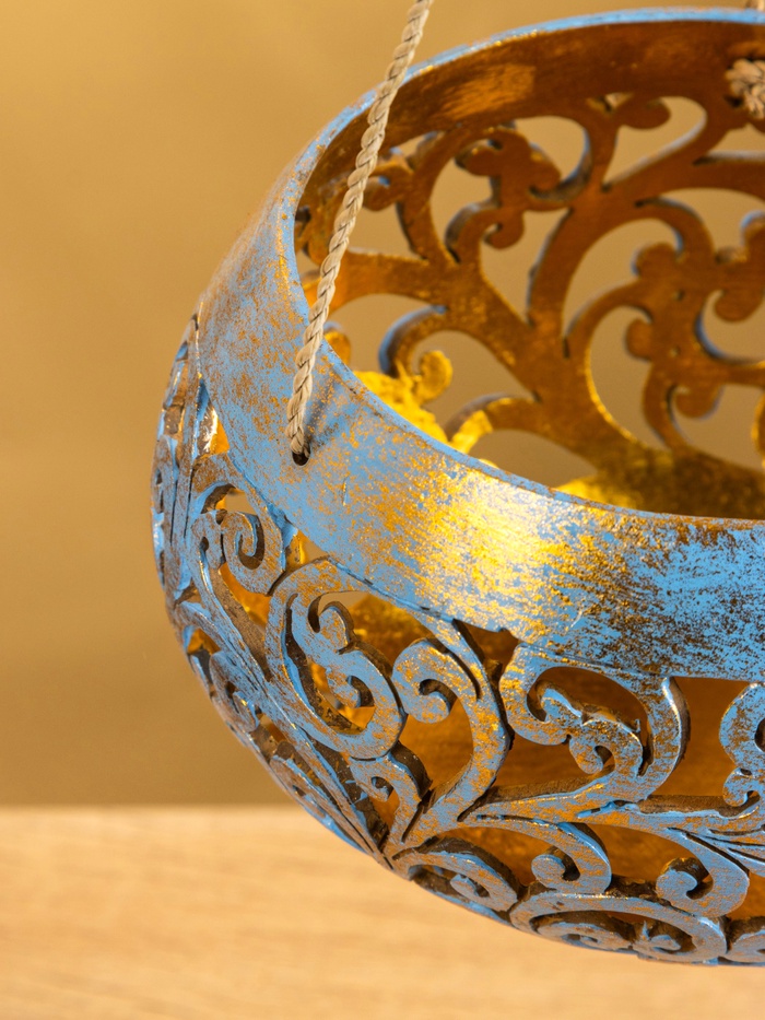 Подсвечник подвесной из кокоса, 14×14×10 см, голубой-золотой