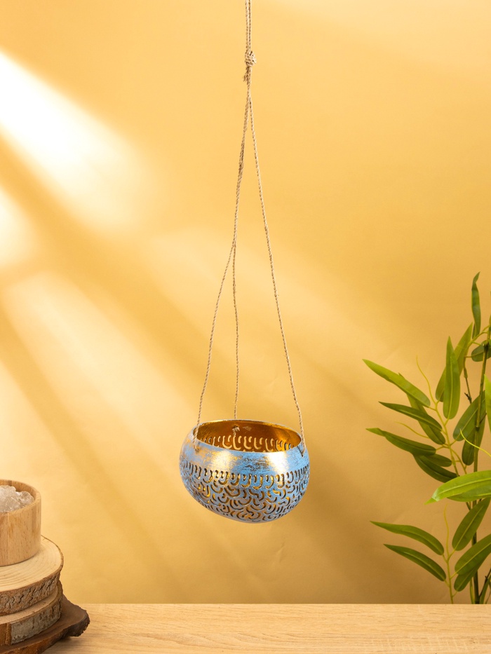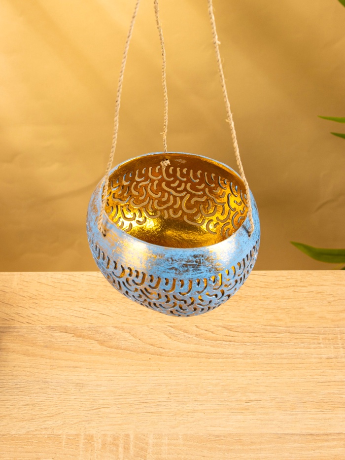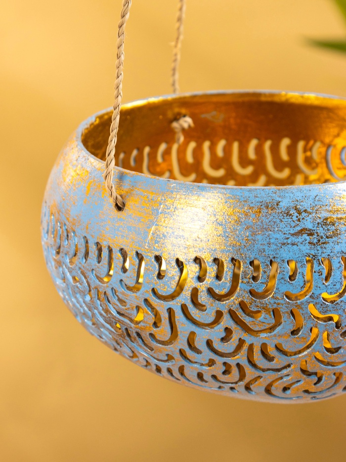 Подсвечник подвесной из кокоса, 14×14×10 см, сине-золотой