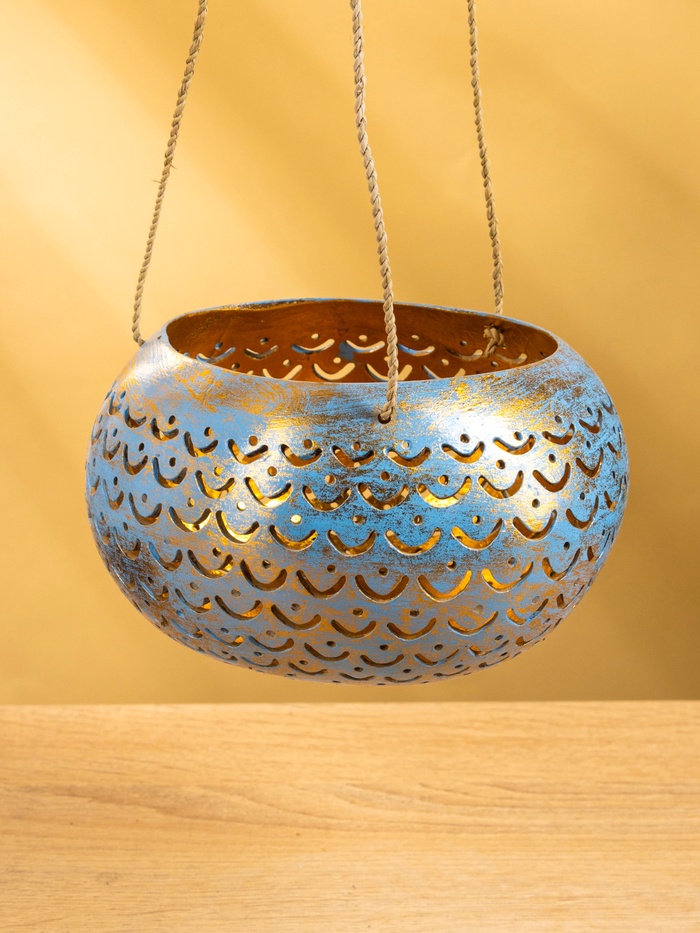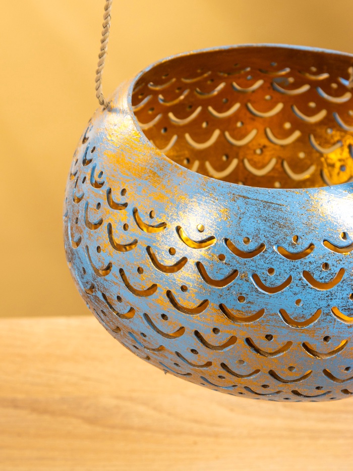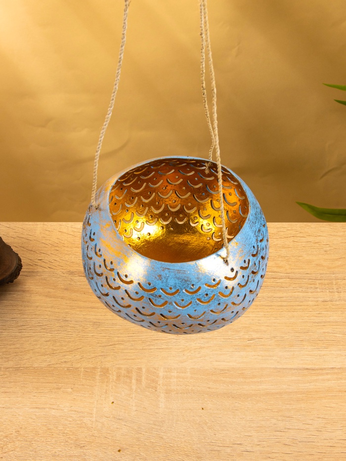 Подсвечник подвесной из кокоса, 14-16 см, сине-золотой