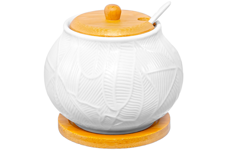 Сахарница с ложкой из серии «Танзания» от Elan Gallery предназначена для красивой сервировки вашего стола. Размер изделия – 11х11х12 см, объём – 620 мл. Выполнена из высококачественного белого фарфора. Он не впитывает цвет продуктов и легко отмывается, благодаря чему надолго сохранит свою белизну. Поверхность изделия украшает рельеф из налегающих друг на друга тропических листьев с тонкими прожилками. Крышка и подставка выполнены из натурального бамбука. Декоративная баночка гармонично дополнит сервировку любого стола и добавит особого шарма вашему кухонному инвентарю. Вместительный контейнер подойдёт для хранения сахара и соли, специй, приправ и других сыпучих продуктов. Эстетичную ёмкость с крышечкой можно приспособить не только под сахар, но и под варенье, мёд или икру. Вы с лёгкостью наберёте необходимое количество с помощью ложечки, которая компактно помещается в баночку благодаря выемке на крышке. Отлично послужит в качестве медовницы и станет изящной альтернативой традиционным медовым горшочкам и бочонкам! Не рекомендуется применять абразивные моющие средства. Без бамбуковых элементов подходит для использования в посудомоечной машине и микроволновой печи. Бамбук нельзя замачивать! Поставляется в дизайнерской картонной коробке – благодаря ей вам не потребуется дополнительная подарочная упаковка. Фарфоровая сервировочная посуда послужит оригинальным подарком для хозяйки, ценящей не только практичность, но и привлекательность. Серия «Танзания» от бренда Элан Галерея станет украшением любого кухонного инвентаря и позволит собрать сервиз в едином стиле! /