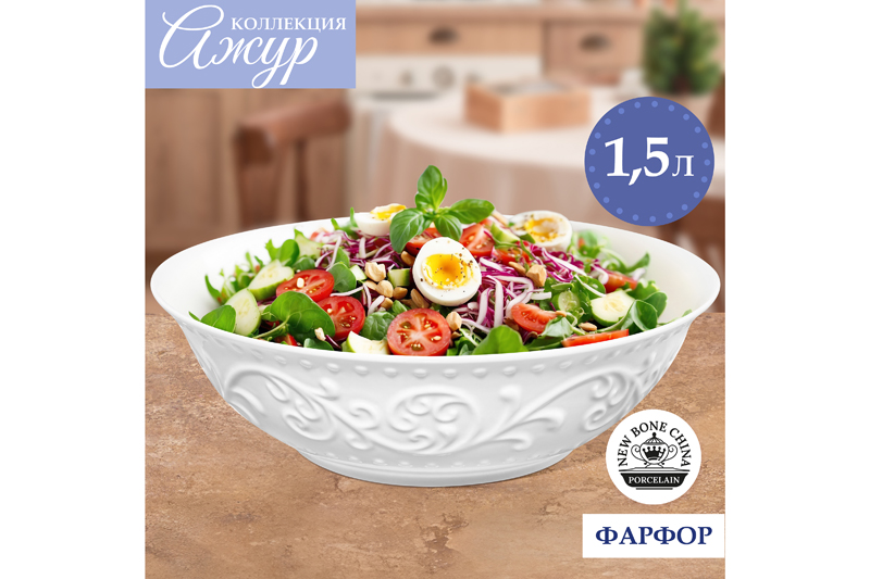 Салатник из серии "Ажур" от Elan Gallery предназначен для эстетичной сервировки вашего стола. Размер изделия – 23х23х7 см, объём – 1,5 литра. Диаметр дна – 12 см. Выполнен из фарфора нового поколения new bone china, сочетающего в себе изящность и высокую прочность. За счёт гладкой структуры фарфоровое изделие легко отмывается, поэтому сохраняет привлекательный внешний вид и практично в использовании. От классического костяного фарфора new bone china отличается большей экологичностью в производстве. Поверхность изделия украшают вьющиеся и точечные рельефные узоры. Большая глубокая миска станет идеальным вариантом для любителей здорового питания. Используйте для приготовления и подачи салатов, а также для сервировки овощей и фруктов. Кроме того, салатница подойдёт для холодных закусок и гарниров, разнообразных сладостей и десертов. Задействуйте в качестве конфетницы, организовав уютное чаепитие. Мягкая округлая форма и изысканный дизайн позволят глубокому блюду гармонично дополнить интерьер любой кухни или столовой. Не рекомендуется применять абразивные моющие средства. Подходит для использования в посудомоечной машине и микроволновой печи. Поставляется в дизайнерской картонной коробке – благодаря ей вам не потребуется дополнительная подарочная упаковка. Фарфоровая сервировочная посуда станет приятным подарком для тех, кто ценит сочетание практичности и эстетики. Серия "Ажур" от бренда Элан Галерея станет украшением любого кухонного инвентаря и позволит собрать красивый сервиз в едином стиле! /