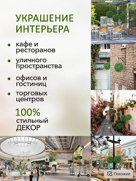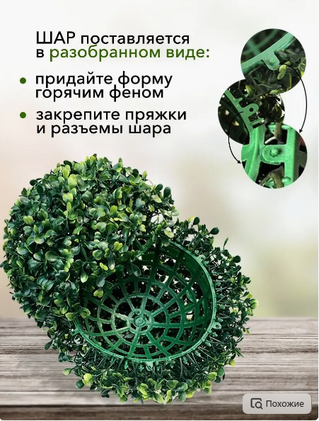 Искусственный растение самшитовый шар - прекрасное украшение современных интерьеров и ландшафта. Декоративные искусственные шары можно использовать как внутри помещения, так и снаружи. Вы можете подвесить их на невидимой леске или положить в кашпо. Материал, из которого изготовлены шары легко выдерживает прямые солнечные лучи, влажность, морозы и отлично подходит для использования на улице круглый год. Основой шара из самшита служит пластиковая сетчатая сфера.Шар поставляется в разобранном виде, как две полусферы. Необходимо собрать его по пыжевым соединениям. Если искусственная зелень трава помялась в процессе транспортировки, то рекомендуем ее расправить при помощи нагревания. Подержите в очень горячей воде или над паром, или используйте фен с горячим воздухом. Помогите руками расправить зелень, когда она станет мягкой от нагревания. Уход за искусственным самшитом самый простой, его достаточной 2-3 раза в сезон очищать от пыли, для этого нужно промыть водой. Если шар для декора стоит на улице, то это можно сделать при помощи шланга, в помещении для промывки самшита можно использовать брызгалку с водой.