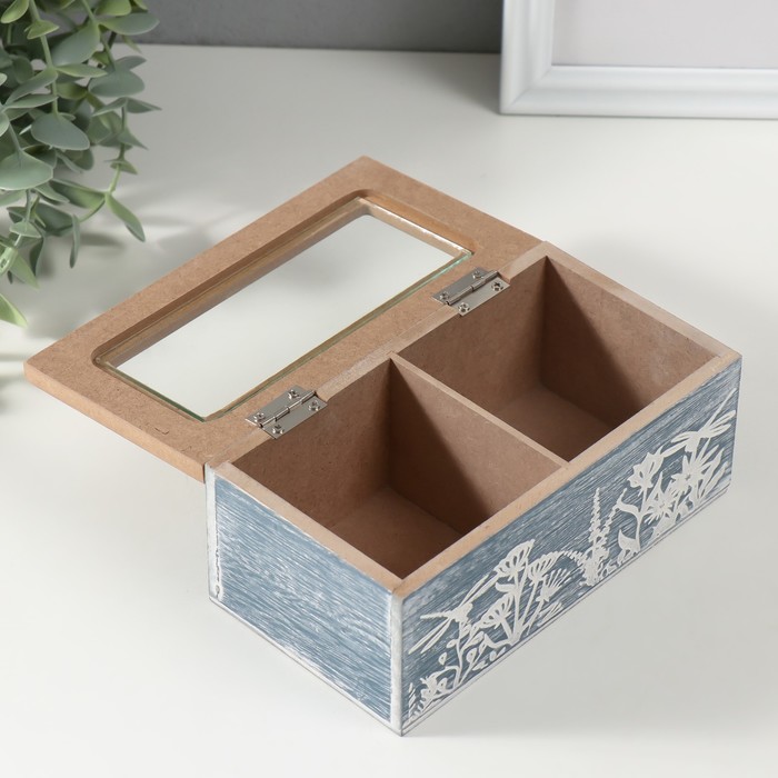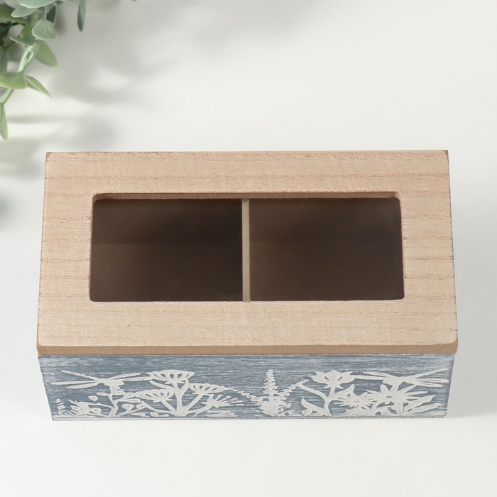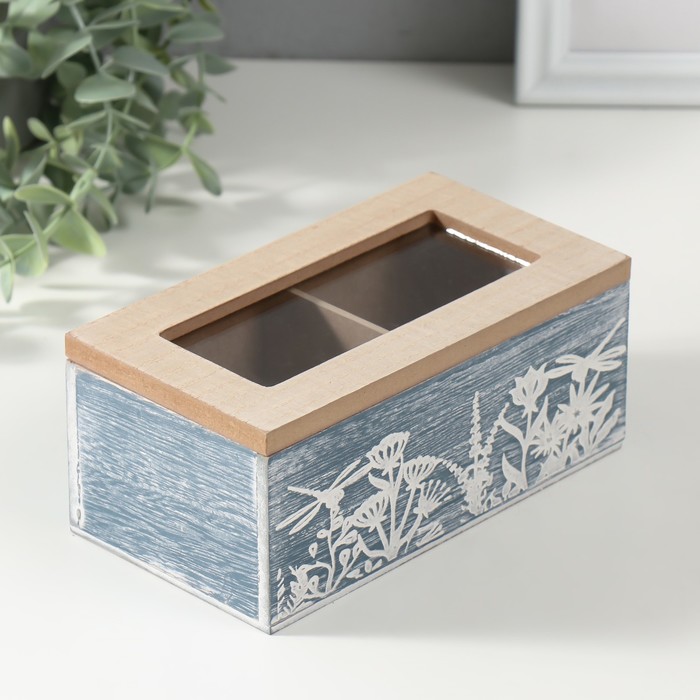 Шкатулка для чая 2 деления «Стрекозы и цветы», дерево, синяя, 8.8×16.2×7 см