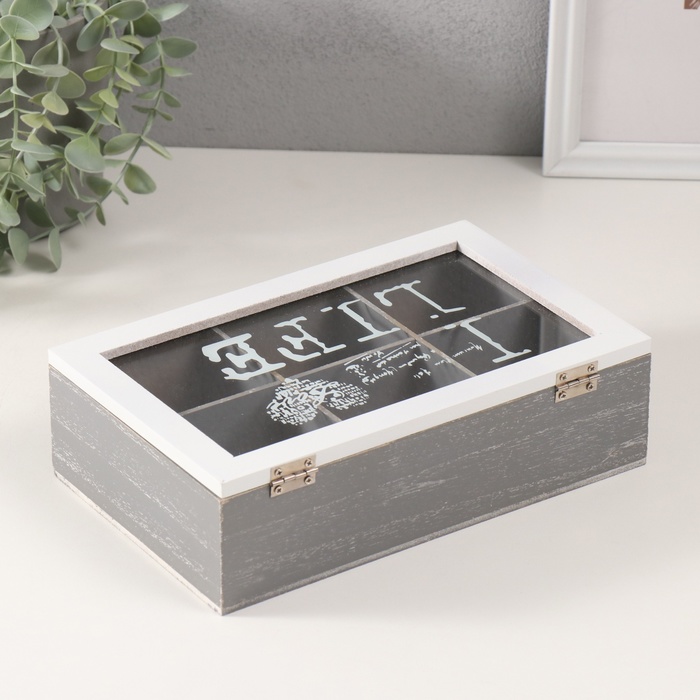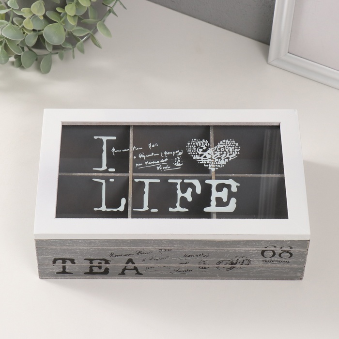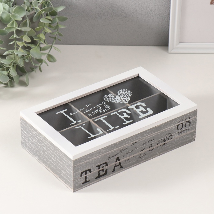 Шкатулка для чая 6 делений «Я люблю жизнь», дерево, серо-белая, 15×24×7 см