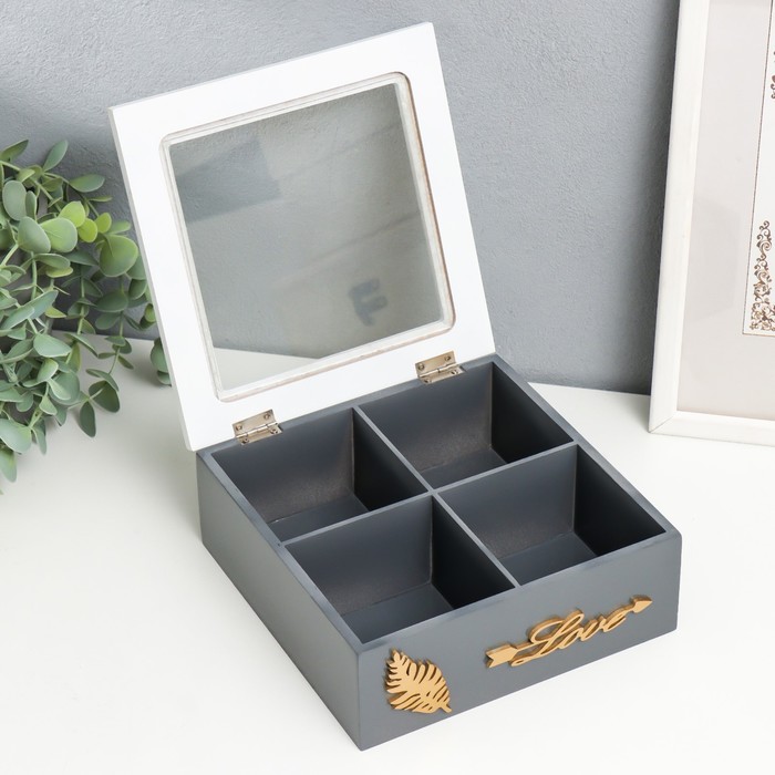 Шкатулка для чая «Лист папоротника», с делениями, дерево, стекло, бело-серая, 18×18×7 см