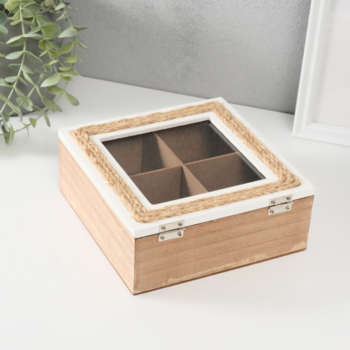 Шкатулка для чая с делениями «С рамкой из джута», дерево, 23.5×23.5×7 см