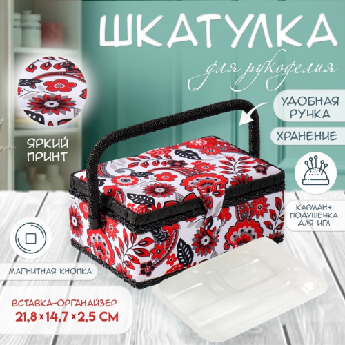 Эта шкатулка для рукоделия с цветочным узором станет вашим личным пространством для творчества. В ней царит идеальный порядок: все инструменты и мелочи лежат на своих местах, готовые к работе в любой момент. Она понимает потребности мастерицы и отвечает им продуманной организацией внутреннего пространства.