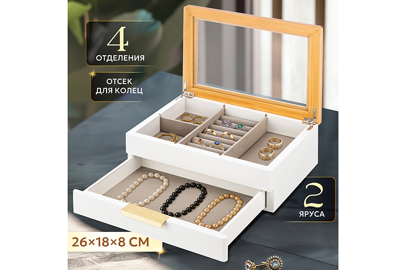 Шкатулка для украшений от Elan Gallery послужит универсальным органайзером для ювелирных изделий и бижутерии. Общий размер изделия – 26х18,5х8,5 см. Состоит из двух ярусов и откидной бамбуковой крышки. Верхний ярус включает два маленьких отделения, одно большое, и один специальный отсек для колец. Нижний ярус представляет собой выдвижной ящичек свободного назначения. Эстетичная коробочка белого цвета поможет навести порядок даже в богатой коллекции драгоценностей! Прочные разделители помогут сортировать аксессуары удобным для вас способом: по типу изделия, цвету или материалу. Разложите по отсекам кулоны, колье или цепочки из золота, серебра и других металлов. Отделение для колец также можно использовать для хранения серёг-колец или серёжек-гвоздиков. Заполните вместительный нижний ярус браслетами или наручными часами, а также декоративными изделиями, контейнерами с бусинами, швейными принадлежностями или любыми другими вещами. Прозрачное окошко из пластика позволит вам увидеть содержимое верхнего ящика даже под закрытой крышкой. Такая шкатулка станет оригинальным подарком как для девочки-подростка, так и для женщины. Подарите её маме, бабушке или подруге, чтобы порадовать их стильным и практичным дополнением хозяйственного инвентаря. Нежный и эстетичный дизайн гармонично впишет изделие в любой интерьер, позволяя хранить коробку даже на открытой полке. Это особенно удобно для тех, кто пользуется украшениями ежедневно. Поставляется в прочной картонной упаковке. В коллекции бренда Элан Галерея вы найдет большой ассортимент товаров для дома, которые помогут вам организовать бережную систему хранения ваших вещей!
