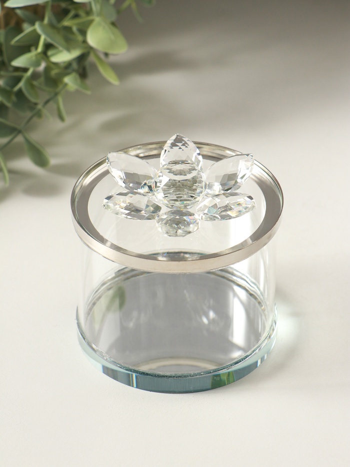 Эта стеклянная шкатулка для драгоценностей — элегантное решение для хранения ваших самых ценных вещей. Её чистая, прозрачная форма напоминает хрустальную каплю или лепесток, добавляя лёгкости и изящества любому интерьеру. Прочный серебристый ободок и плотно прилегающая крышка надёжно защищают содержимое от пыли, сохраняя порядок и блеск ваших украшений.