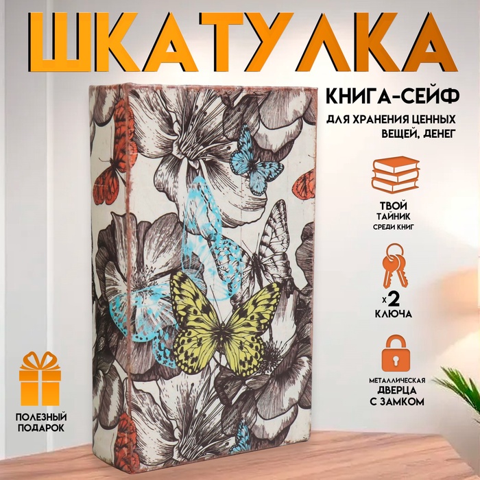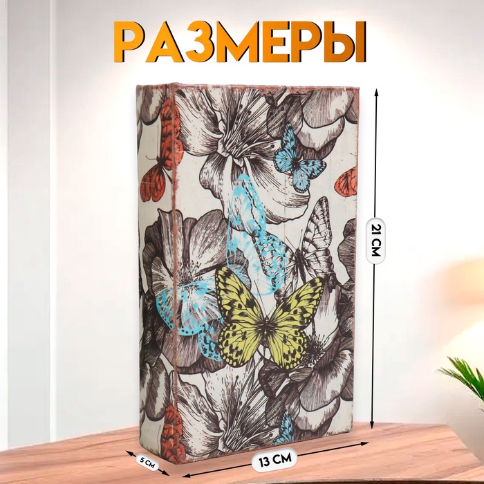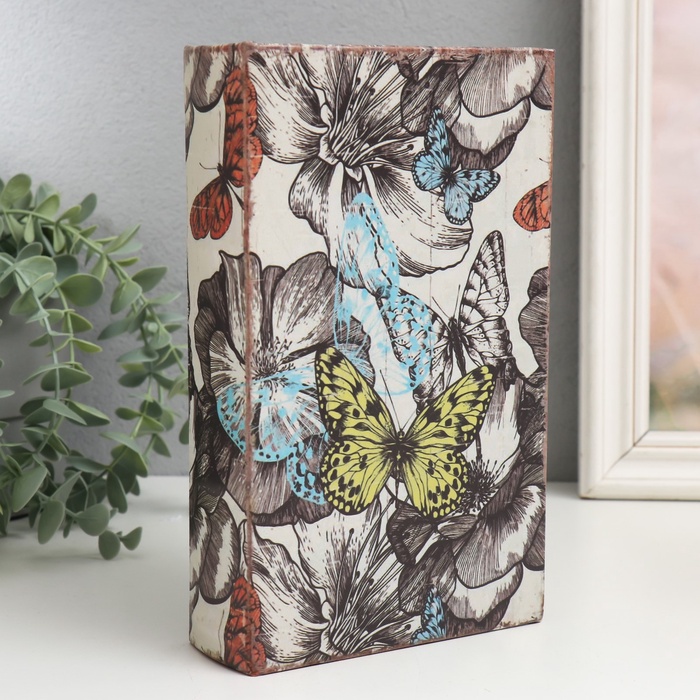 Шкатулка книга - сейф «Цветы и бабочки», дерево и искусственная кожа, с замком, 21×13×5 см