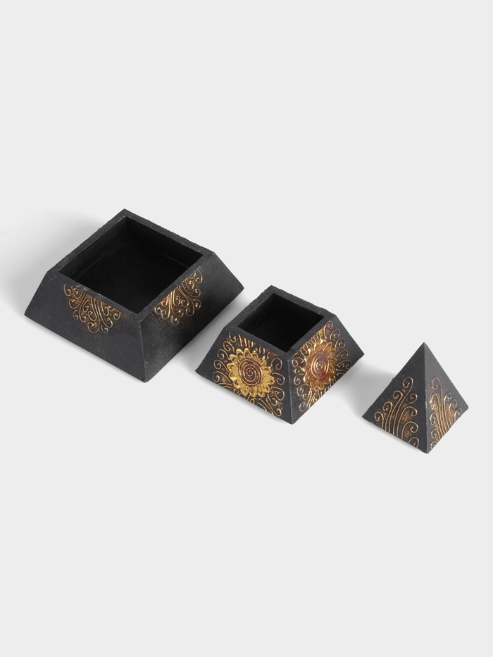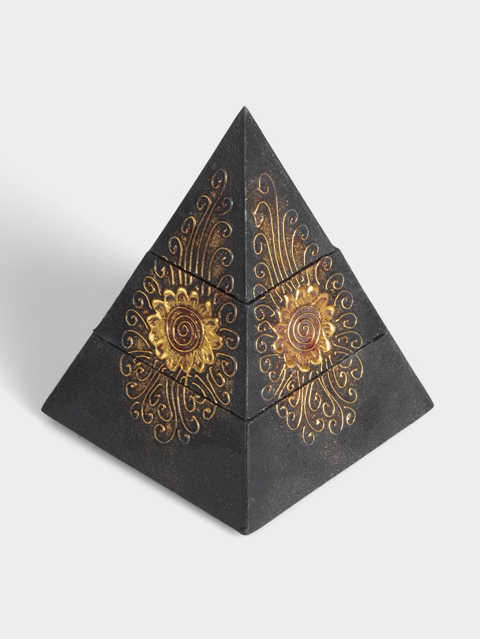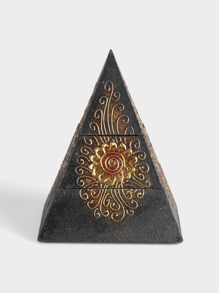 Шкатулка в форме пирамидки — чёрная фигурная коробочка с растительным орнаментом. Её необычная форма вдохновлена геометрией древних символов, а мягкий цветочный узор придаёт лёгкость строгому силуэту. Это не просто место для хранения — это арт-объект, который притягивает взгляд и дарит ощущение тайны даже в самом обыденном интерьере.