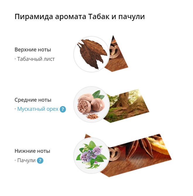 Богатый насыщенный аромат табачного листа в сочетании с пряной сладостью мускатного ореха и теплым смолисто-дымным ароматом пачули.