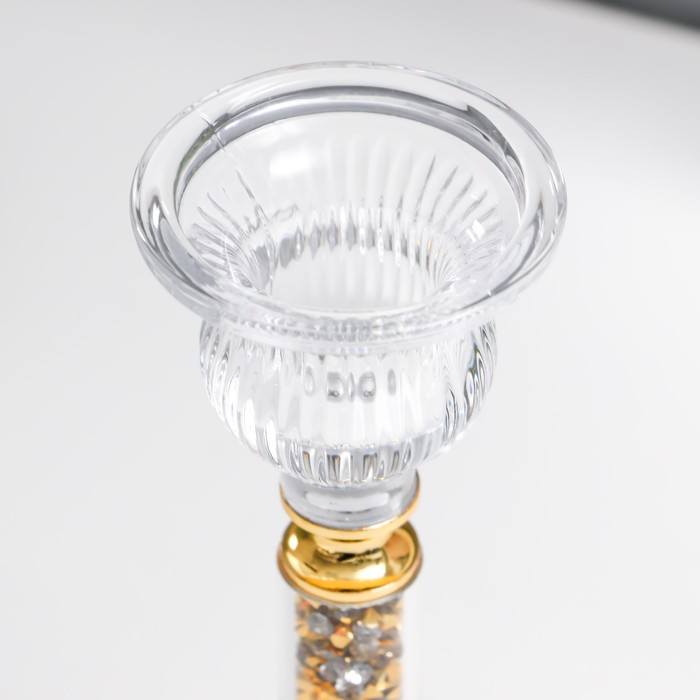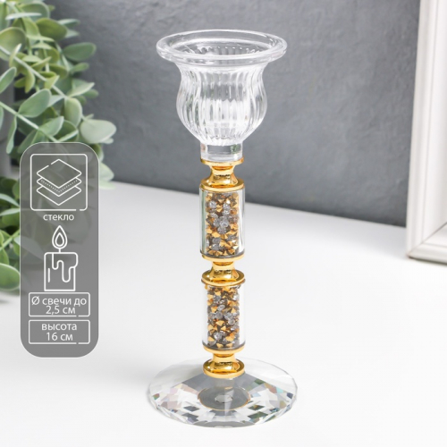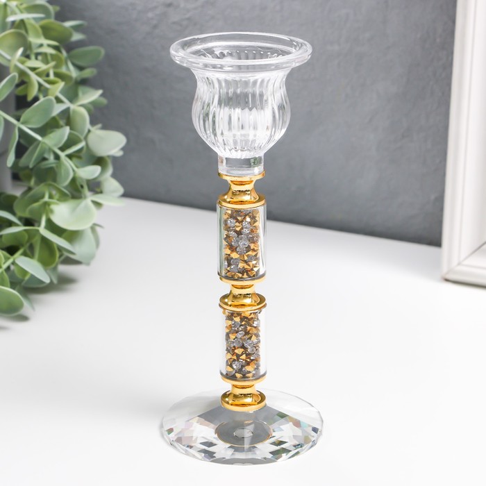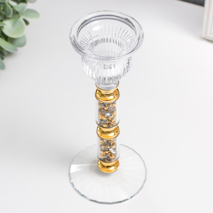 Стеклянный подсвечник на 1 свечу «Ребристый на ножке со стразами», с золотом, d=2.5 см, 7×7×16 см