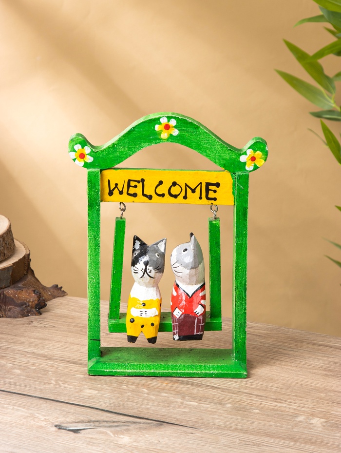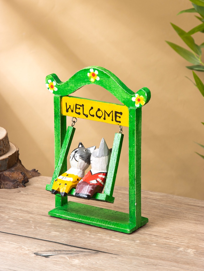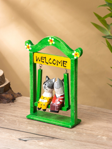 Интерьерная композиция «Кошечки на качелях» — трогательная сцена из дерева, раскрашенная в мягкие разноцветные тона. Высота 25 см делает её заметной, но не доминирующей: она легко вписывается на полку, подоконник или домашний уголок уюта, добавляя пространству лёгкости и доброты.