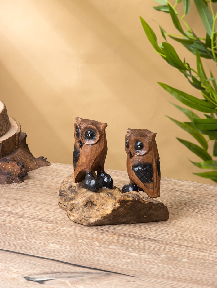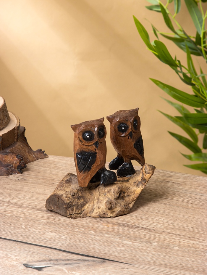 Интерьерная композиция «Совушки» — тёплая деревянная сцена с двумя мудрыми птицами, выполненная в естественных коричневых оттенках. Её компактный размер (14 см в высоту) и живая текстура дерева делают её уместной на книжной полке, рабочем столе или в детской — везде, где хочется немного тишины и доброго взгляда.