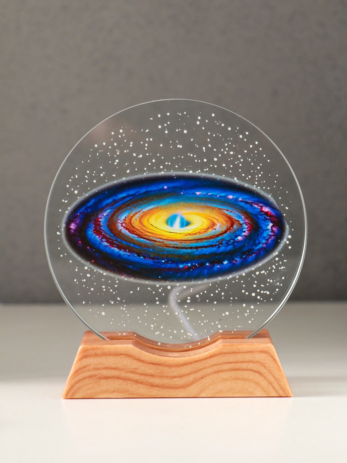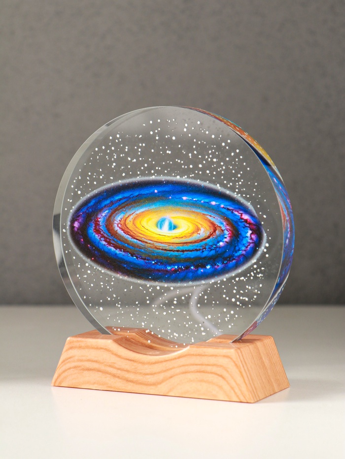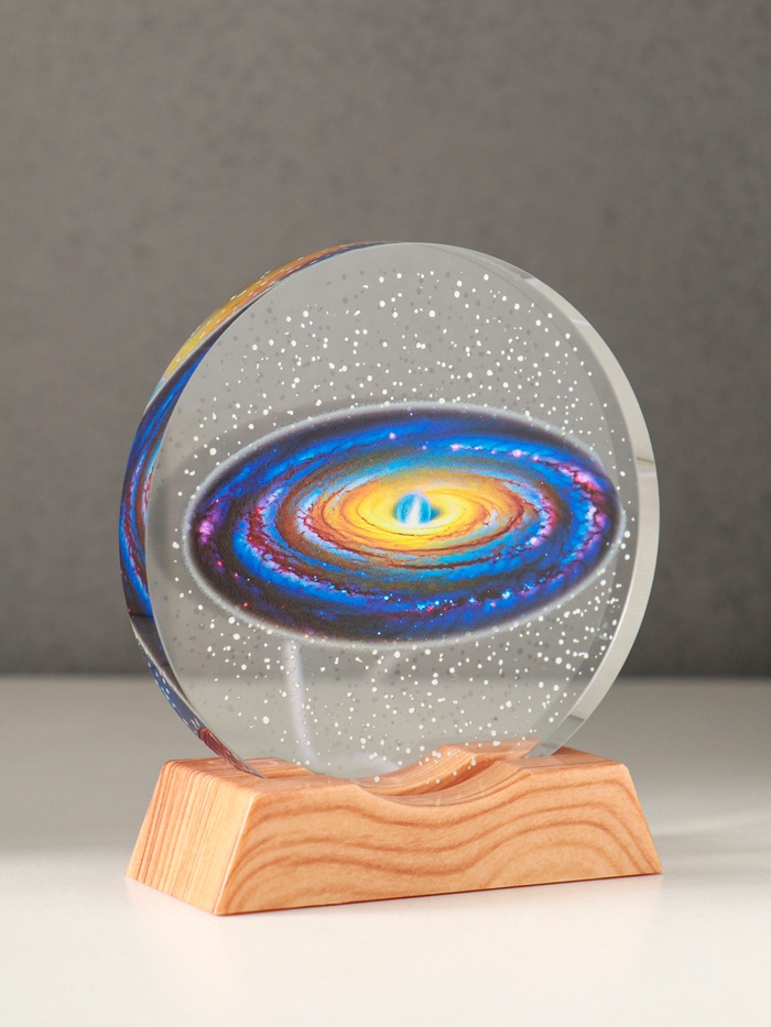 Эта голографическая световая фигура станет ярким акцентом в вашем пространстве. Поместите её на стол или полку, чтобы наблюдать, как в стеклянном диске рождается трёхмерная проекция нашей галактики. Мерцающие звёзды и туманности создают эффект портала в глубины космоса, наполняя комнату загадочной атмосферой.