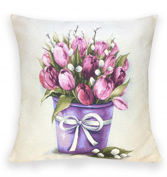 Такой гобеленовый чехол даст положительные эмоции. На молочном фоне стоит сиреневое кашпо, в котором находятся тюльпаны всех оттенков розового, вперемежку с ветками вербы. Такое сочетание выглядит мило и в то же время празднично.