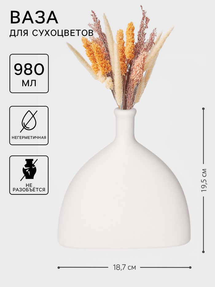 Позвольте себе насладиться элегантностью и функциональностью, которые сочетает в себе эта стильная ваза для сухоцветов. Её лаконичный дизайн и универсальный белый цвет делают её идеальным дополнением к любому интерьеру, будь то современный минимализм или классический стиль.