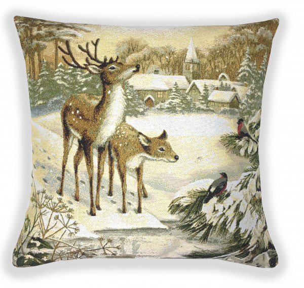 На гобеленовой наволочке изображены пятнистые олени, которые вышли из леса зимой к деревне, на заснеженных лапах елей сидят снегири.