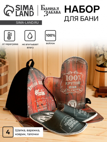* Полный комплект для бани: в входят шапка, рукавица, тапочки и коврик. Все предметы выполнены в едином стиле с узнаваемым принтом — ничего докупать не нужно.
