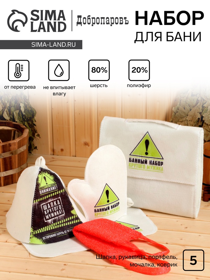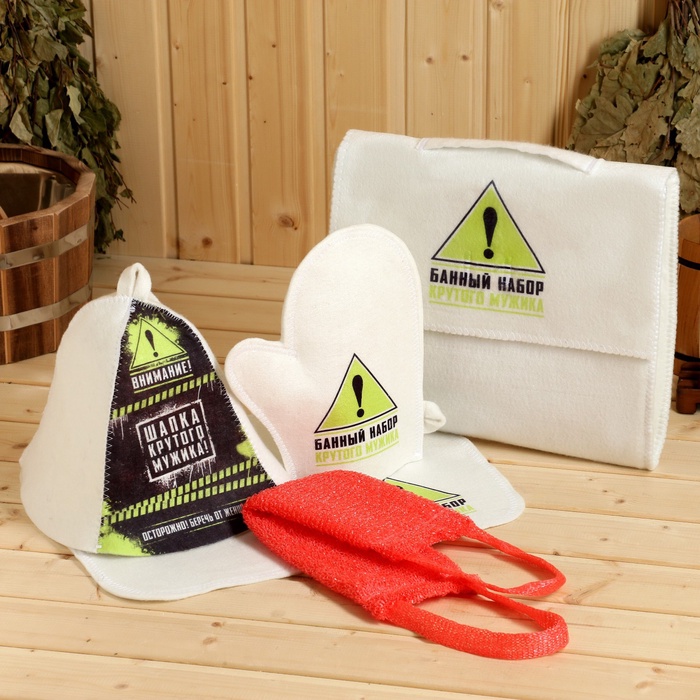 для бани с принтом «Крутой мужик», 5 предметов: шапка, рукавица, портфель, мочалка, коврик, «Добропаровъ»