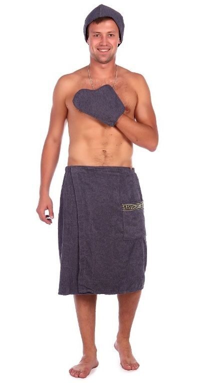 Комплект мужской для бани и сауны СЕРЫЙ махровый 3 пр. (накидка-парэо, чалма, рукавица) хлопок 100%