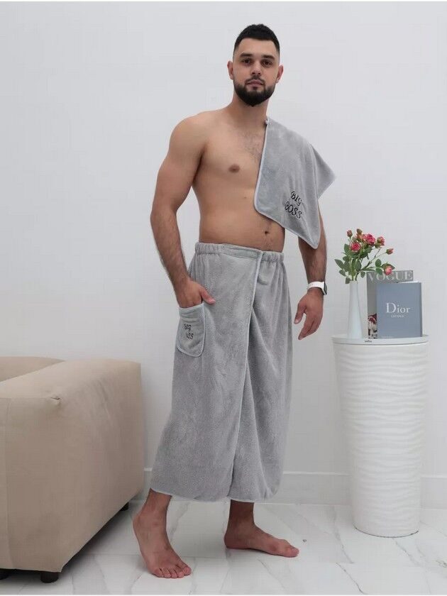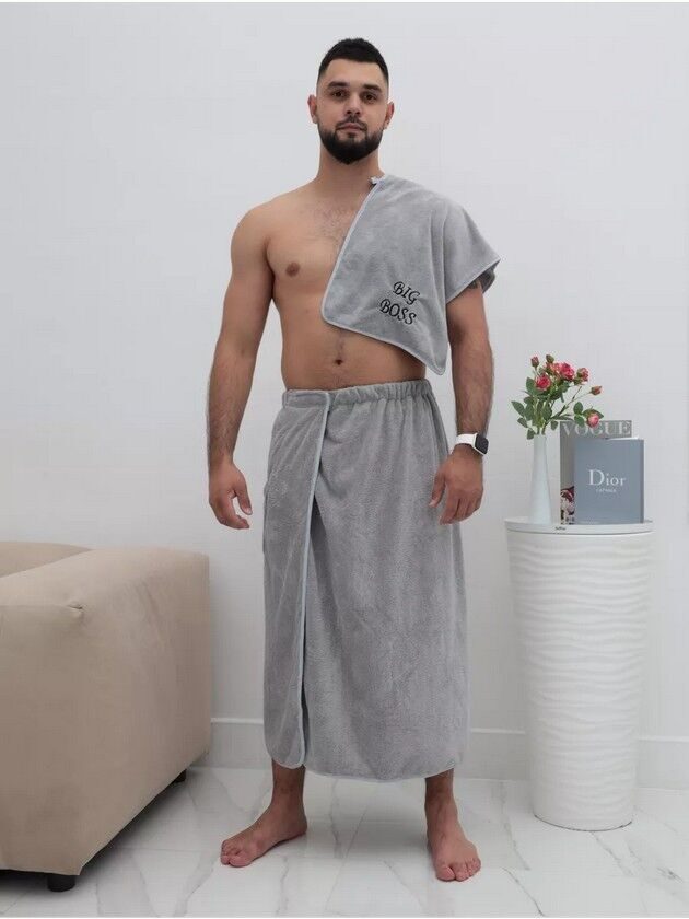 Комплект мужской с вышивкой "BIG BOSS"-СЕРЫЙ 2 пр. (килт+полотенце) микрофибра