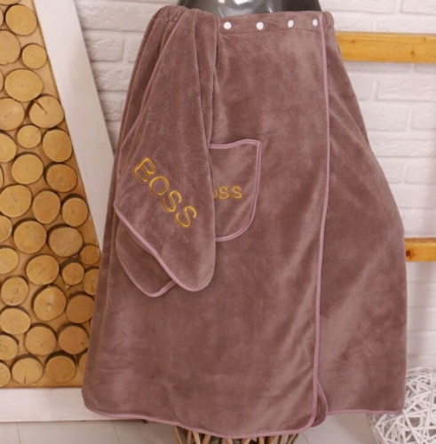Комплект мужской с вышивкой "BOSS"-БЕЖЕВЫЙ 2 пр. (килт+полотенце) микрофибра