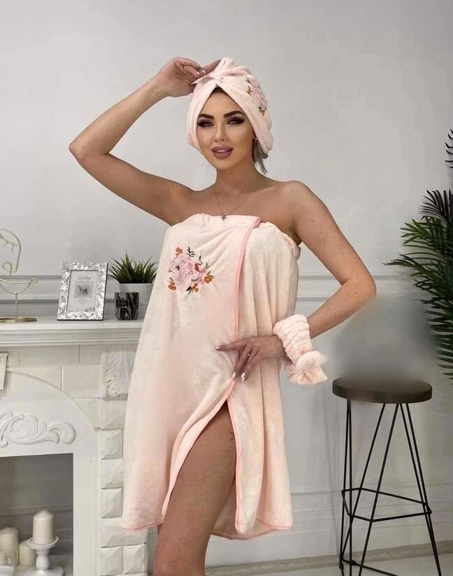 Комплект женский для бани и сауны "Кокетка"-ПЕРСИК микрофибра 3 пр. (парео + чалма+повязка на голову)