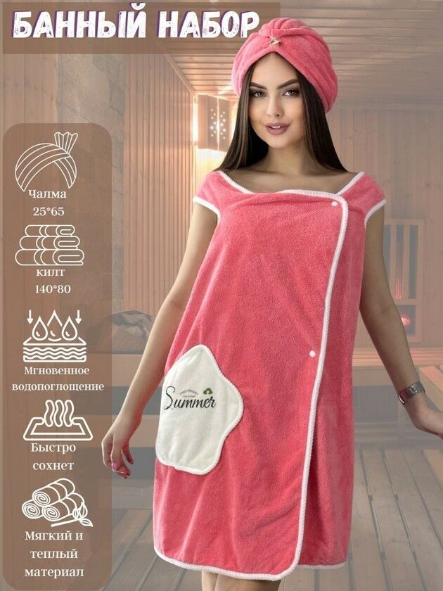 Комплект женский для бани и сауны "Красотка"-КОРАЛЛ микрофибра 2 пр. (парэо + чалма)