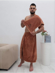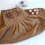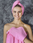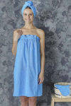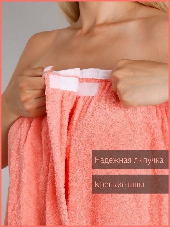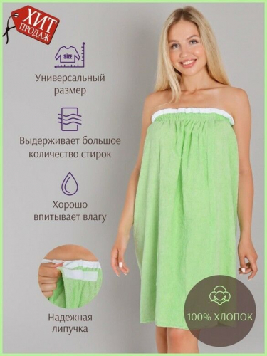 Махровое парео для бани – это удобная и стильная альтернатива полотенцу или простыне. Оно позволяет быстро обернуть тело мягкой тканью с нежным ворсом и надежно зафиксировать ее липучкой. Модель изготовлена из 100% хлопка. Парео очень качественное: оно отлично впитывает влагу, не линяет при стирке в горячей воде, долговечно. Волнообразный верхний край, украшенный декоративным кантом, придает модели нарядный, женственный и кокетливый вид.