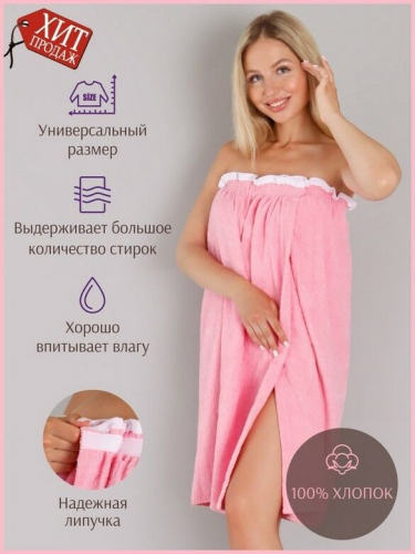 Махровое парео для бани – это удобная и стильная альтернатива полотенцу или простыне. Оно позволяет быстро обернуть тело мягкой тканью с нежным ворсом и надежно зафиксировать ее липучкой. Модель изготовлена из 100% хлопка. Парео очень качественное: оно отлично впитывает влагу, не линяет при стирке в горячей воде, долговечно. Волнообразный верхний край, украшенный декоративным кантом, придает модели нарядный, женственный и кокетливый вид.