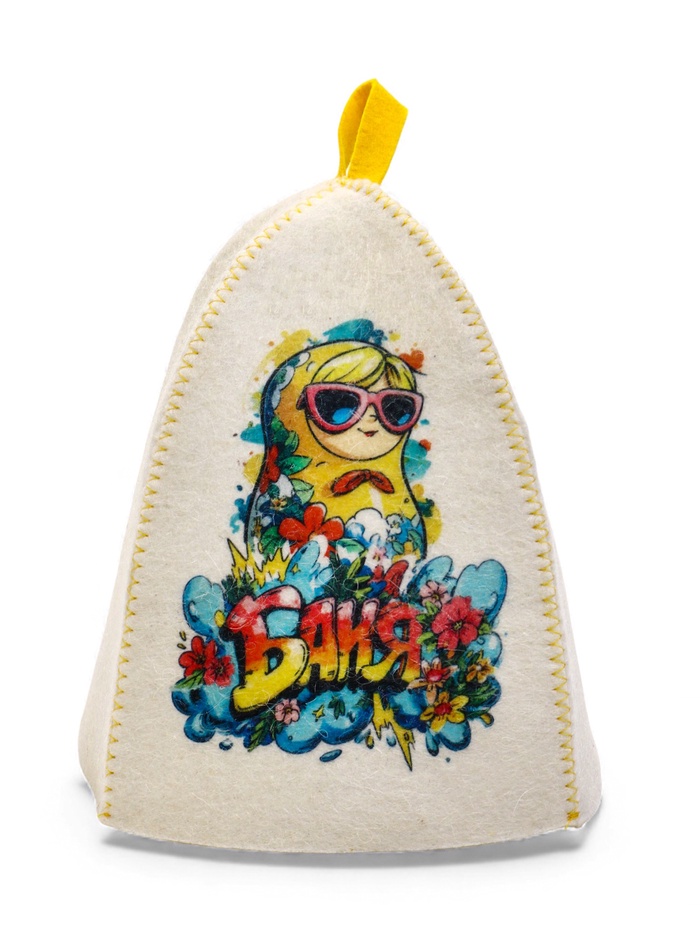Шапка для бани и сауны «Матрешка в очках», полиэфир, шерсть, белая