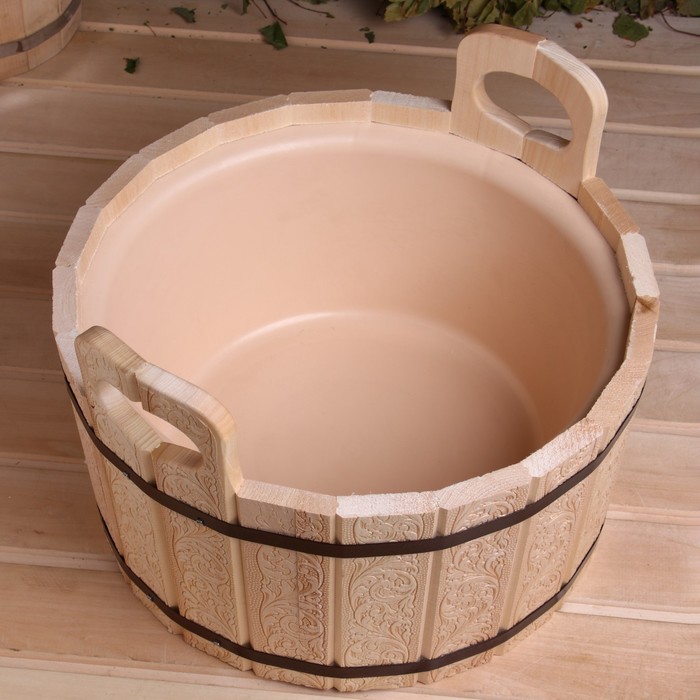 Шайка - таз для бани и сауны «Русский узор», 12 л, деревянная, пластиковая вставка, «Добропаровъ»