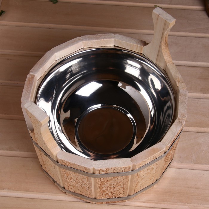 Шайка - таз для бани и сауны «Русский узор», 5 л, деревянная, нержавеющая вставка, «Добропаровъ»