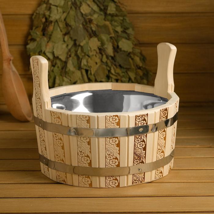 Шайка - таз для бани и сауны «Русские узоры», 6 л, деревянная, нержавеющая вставка, «Добропаровъ»