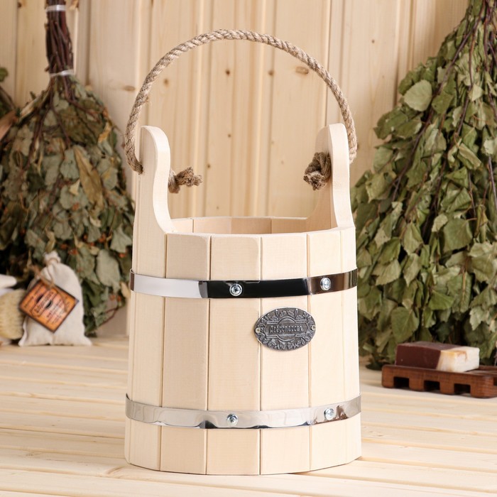 Ведро - запарник для бани и сауны «Емеля», 5 л, липа, нержавеющий обруч, ручка - верёвка, «Добропаровъ»