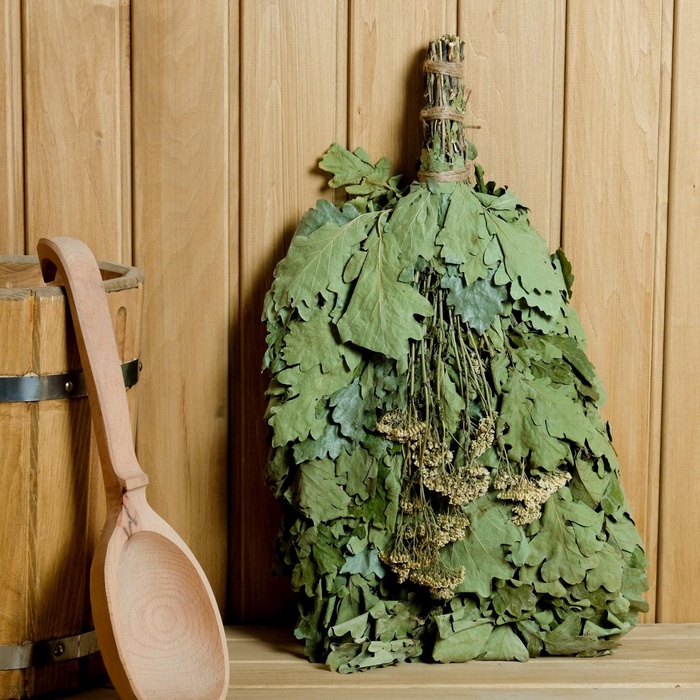 Веник для бани дубовый, с тысячелистником