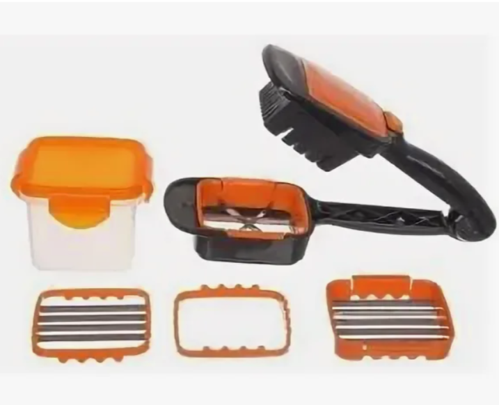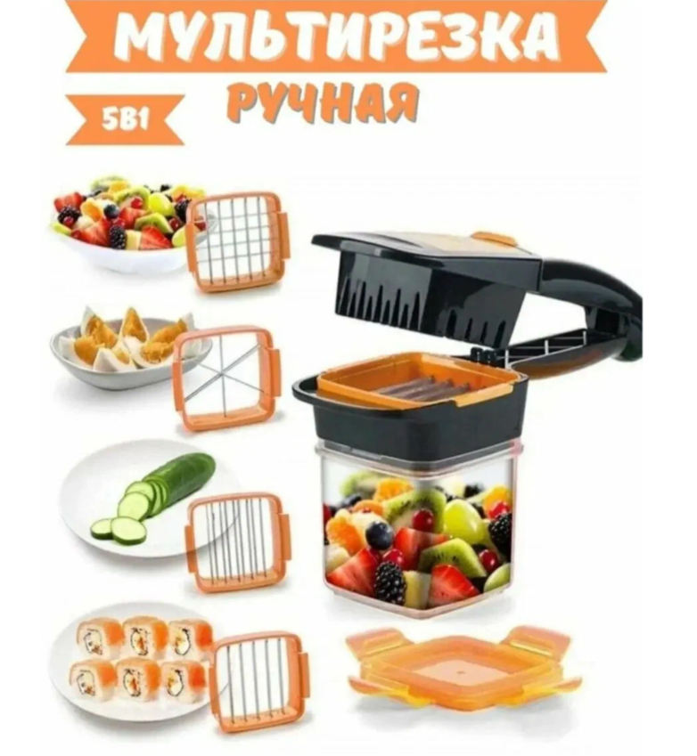 Овощерезка 5 в 1. - это новая быстрая мультирезка. С этой овощерезкой Вы быстро нарежете картошку, огурцы, помидоры, кабачки, перец, лук, яйца, различные фрукты и многое другое. Можно резать прямо на сковороду, блюдо или кастрюлю! Как работает ? Положите ингредиент для нарезки в слайсер, нажмите, и все идеально нарезается. Как твердые, так и мягкие продукты. Есть 4 различных варианта резки, с помощью которых можно нарезать овощи, фрукты и яйца: - Возможность резки тонких ломтиков 5 мм; - Возможность нарезки под толстые ломтики 10 мм; - Возможность резки стержней и блоков 10х 10 мм; - Возможность резки на 6 частей. Лезвия овощерезки острые как бритва из нержавеющей стали, которые обеспечивают быстрые и безупречные результаты резки. Лезвия остаются острыми в течение многих лет, и весь прибор можно мыть в посудомоечной машине после использования. Также имеется пластиковый контейнер (для пищевых продуктов с крышкой для хранения ингредиентов, или взять с собой. Мини есть пластиковый контейнер для пищевых продуктов с крышкой для хранения ингредиентов, или взять с собой и блоков 10 х 10 мм; - Возможность резки на 6 частей. Многофункциональная ручная овощерезка. У измельчителя с контейнером прочные ножи из нержавеющей стали измельчат любой ингредиент, а специальная система блокировки гарантирует безопасность использования. Прозрачная чаша позволит наблюдать и контролировать процесс. Эргономичная ручка и нескользящее основание сделают каждое использование максимально комфортным. Измельчитель для овощей кухонный универсальный подходит для приготовления детского питания, измельчает зелень, овощи, фрукты. Измельчитель для овощей позволяет шинковать овощи прямо в блюдо без использования ножа и доски. Нажав и удерживая одну кнопку, вы с легкостью измельчите чеснок, лук, перец чили