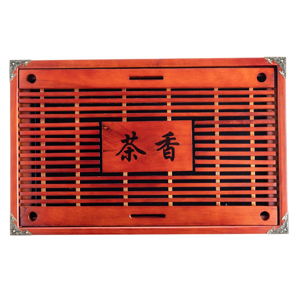 Чайная доска из древесины цвета Вишня с резными металлическими уголками, состоит из прямоугольного поддона и решетчатой крышки с прорезными ручками и изображением орхидеи. В комплект входит груша и шланг. Размеры: 43*28*4,5 см