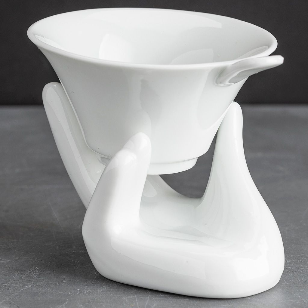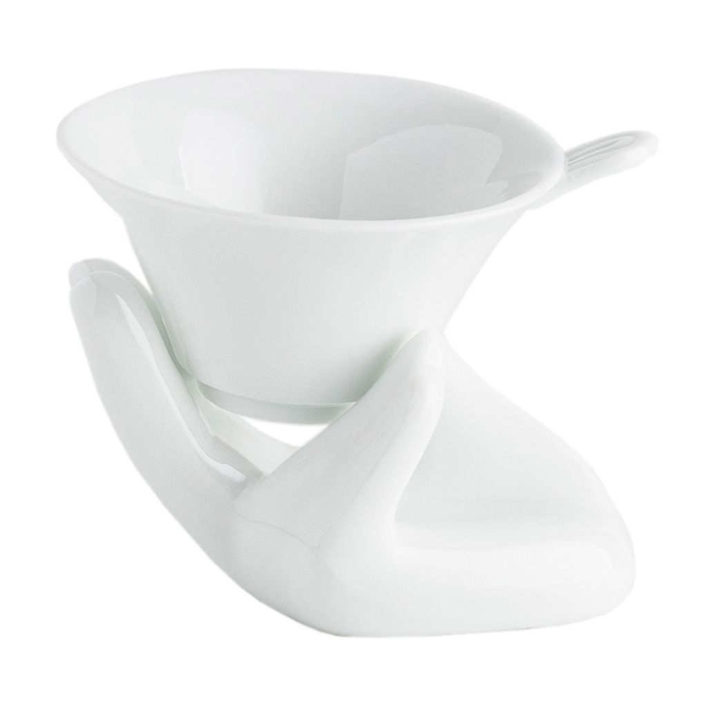 Ситечко конической формы на подставке в виде руки, из белого фарфора