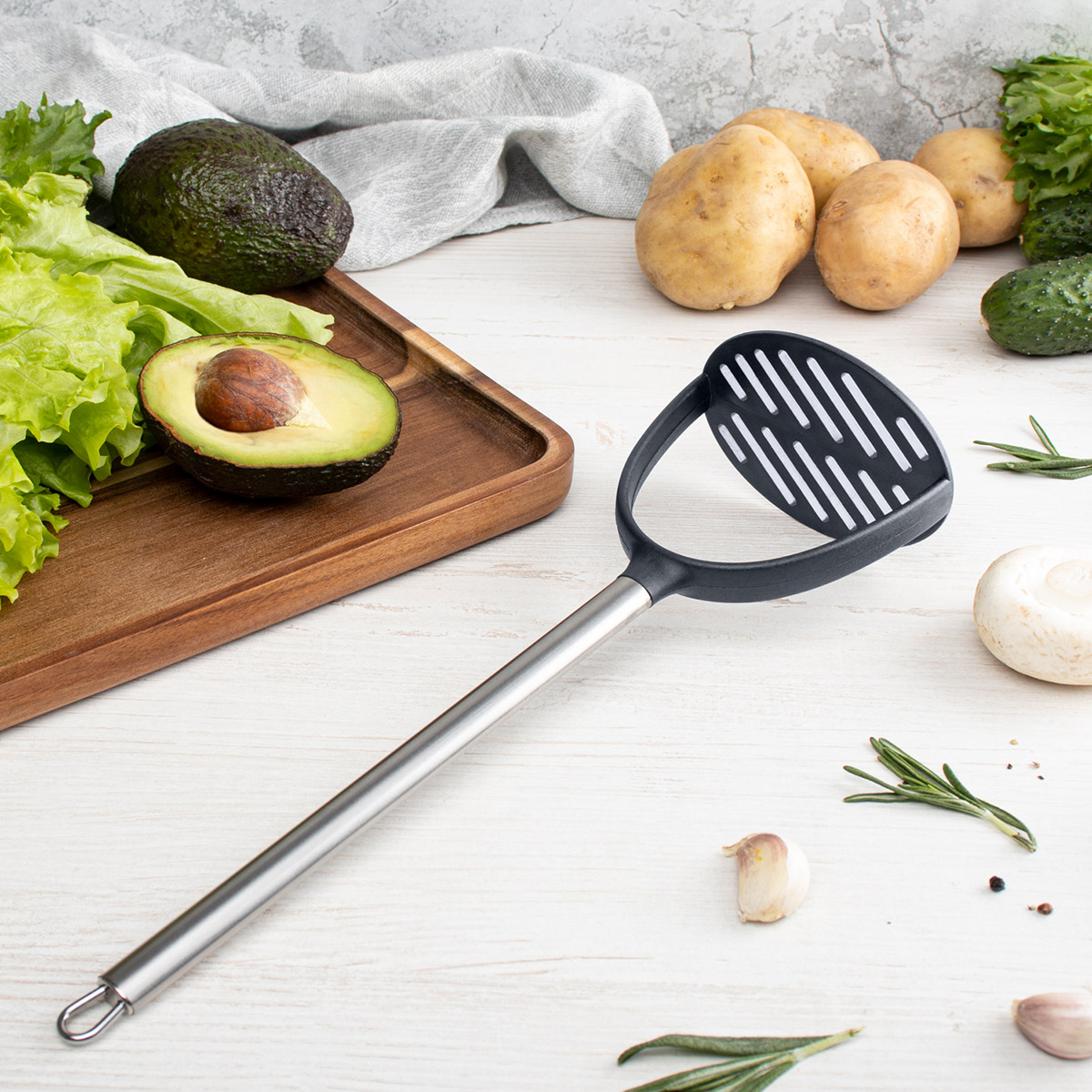 Материал: нержавеющая сталь, термостойкий пластик (нейлон). Безопасный термостойкий пластик выдерживает температуру до 210°C. Цвет пластика: серый. В ручке предусмотрено отверстие для подвешивания.